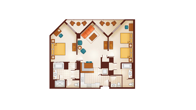 Although smaller than the resorts hotel rooms, Deluxe Studio accommodations provide more of the luxuries accustomed to Disney Vacation Club members. These rooms also sleep four and feature a queen-size bed and queen-size sleeper sofa. Deluxe Studios also include a full bathroom, a small kitchenette area, and a private porch or balcony.